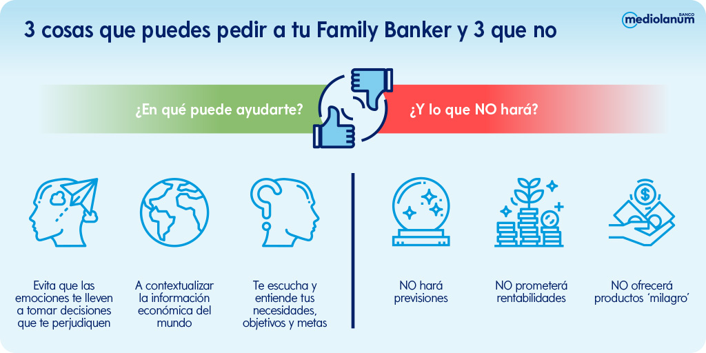 El asesor financiero es una figura al alza en un sector como el bancario en el que cerrar oficinas y prescindir de profesionales es el pan nuestro de cada día. Una figura actualmente en boga que, sin embargo, ha sido el epicentro de Banco Mediolanum desde su nacimiento. Ahora bien, si un profesional financiero como los Family Bankers puede apoyarnos a planificar nuestra economía… ¿Puede también responder a cualquier pregunta? ¿Puede predecir, por ejemplo, qué pasará con nuestras inversiones? ¿Qué debemos esperar de él?