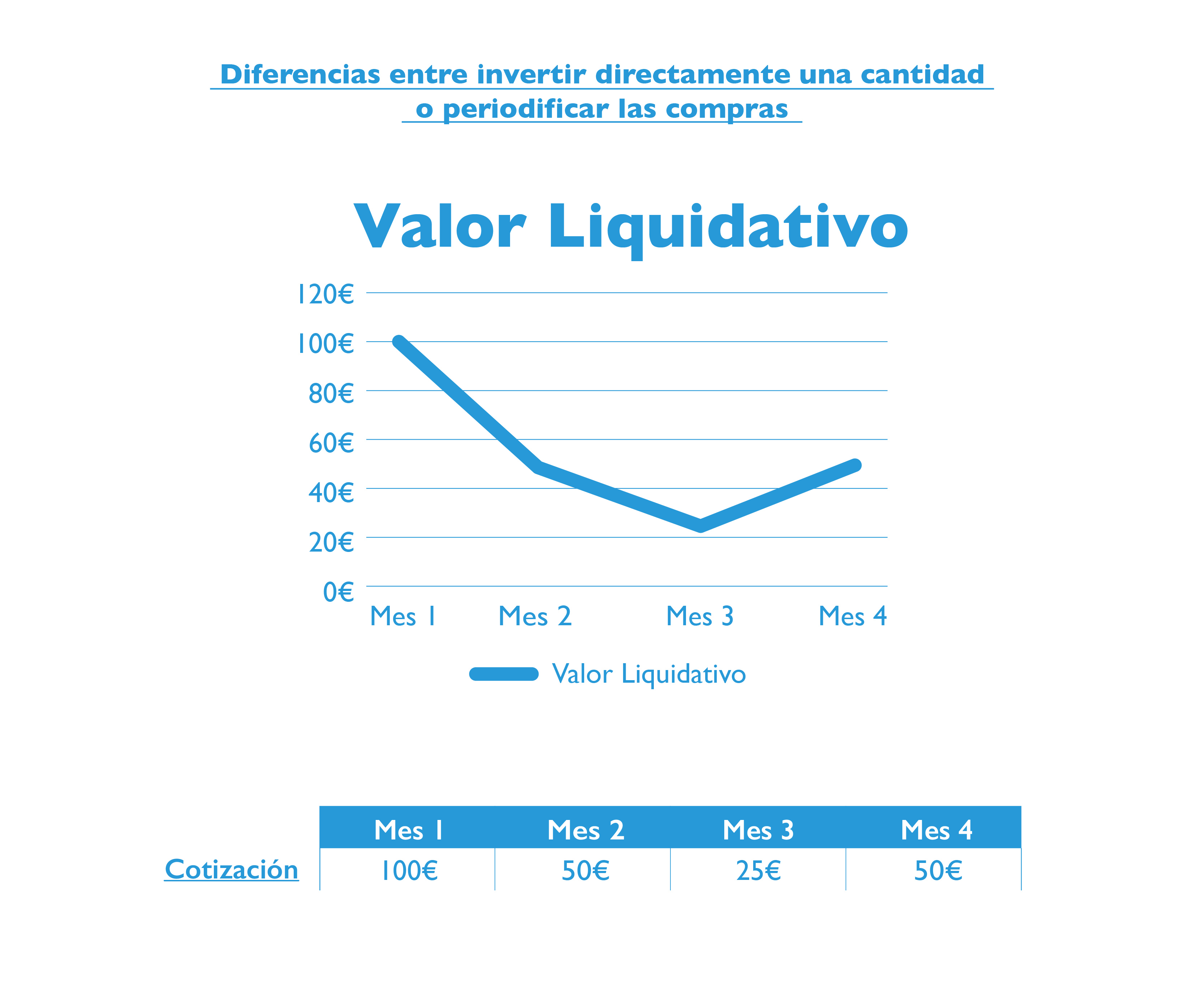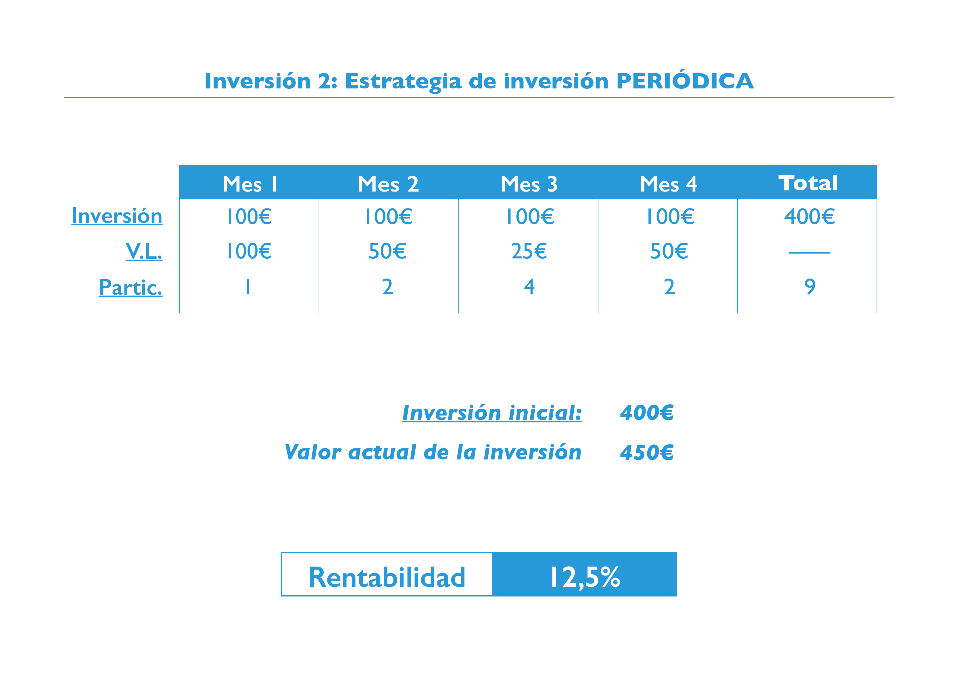 Invirtiendo periódicamente 100 euros cada mes, el primer mes compraríamos 1 participación, puesto que la cotización es de 100 euros. El segundo mes, compraríamos 2 participaciones (cotización a 50 euros), el tercer mes compraríamos 4 participaciones (cotización a 25 euros) y el cuarto mes compraríamos 2 participaciones (cotización a 50 euros). Se pone de manifiesto que la compra del tercer mes es 4 veces más “eficiente” que la del primero, ya que conseguiríamos adquirir 4 participaciones en vez de 1 por los mismos 100 euros. Sin embargo, de no tener una estrategia de inversión periódica, en ese mes de caídas tan pronunciadas el inversor no habría sido capaz de aprovecharse de los bajos precios existentes por culpa de su emotividad.