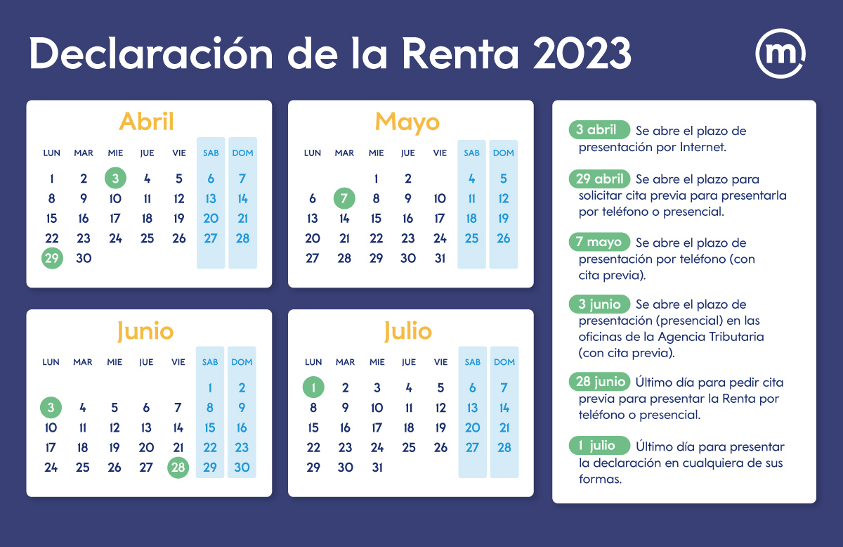 - 3 de junio: se abre el plazo para acudir a las oficinas de la Agencia Tributaria para confeccionar y presentar la declaración de la Renta de forma presencial (con cita previa).