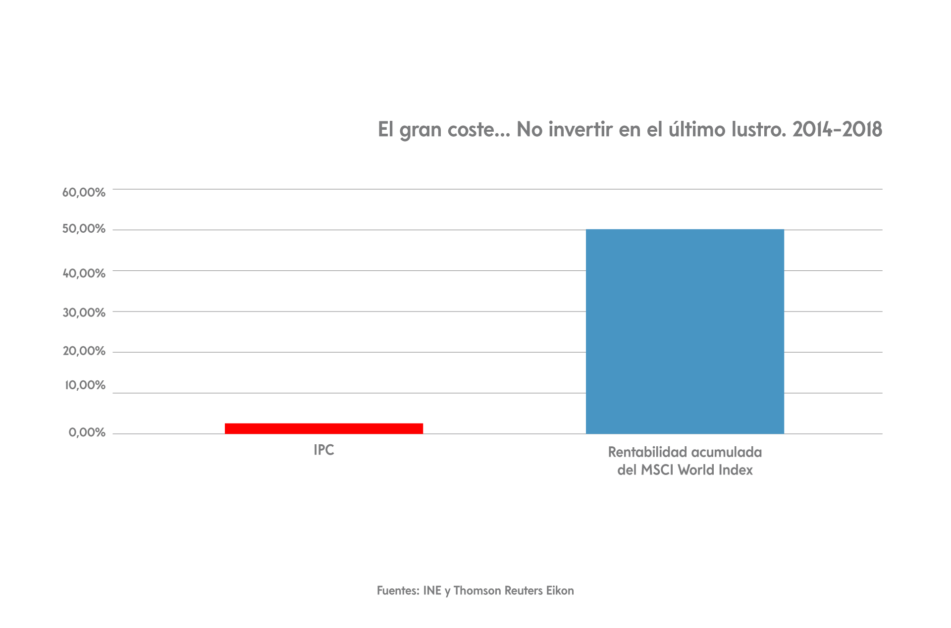 Si lo que busca el inversor es no mover esos recursos ociosos a largo plazo, el mejor activo que existe históricamente es la renta variable. De esta manera, anclará su dinero al capital de las empresas y tendrá más posibilidades de obtener rentabilidades sostenidas, aprovechando la fuerza del interés compuesto a través de los años. De hecho, supongamos que hubiéramos invertido en una cartera que replicara la evolución del índice MSCI World. La rentabilidad acumulada hubiera sido del 50,60%. No solo hubiéramos vencido a la inflación, sino que hubiéramos sacado provecho de esa liquidez ociosa.