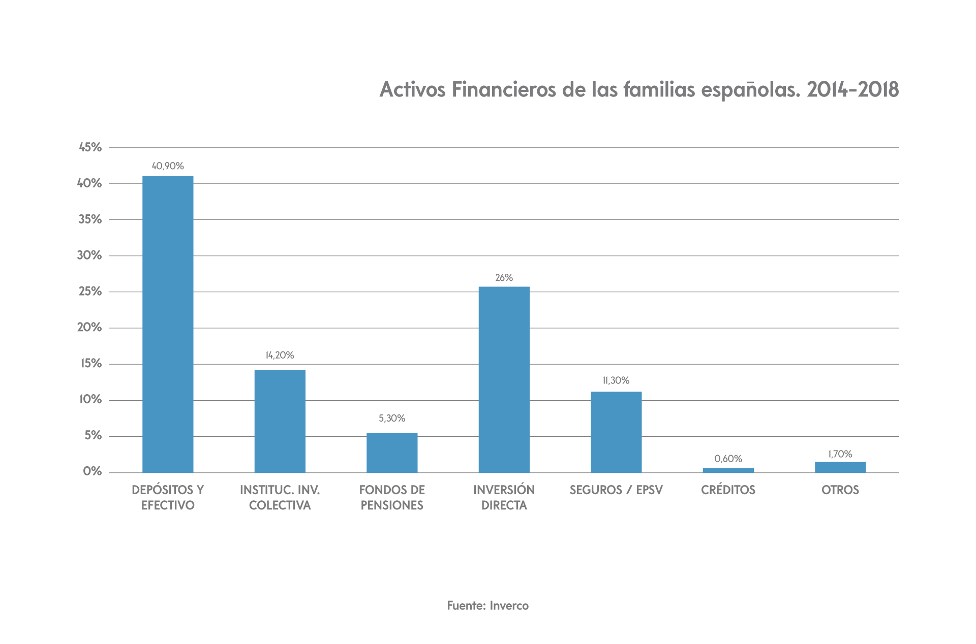 Según los datos del último trimestre de 2018, los depósitos y el efectivo superaban ligeramente el 40% de los activos financieros de las familias españolas. Concretamente, un 38,4% en depósitos y el 2,5%, en efectivo. Una cifra ligeramente por debajo de la suma total de opciones volátiles como los fondos de inversión (14,20%), los fondos de pensiones (5,30%) o la inversión directa en renta variable, renta fija u otros activos (26%).