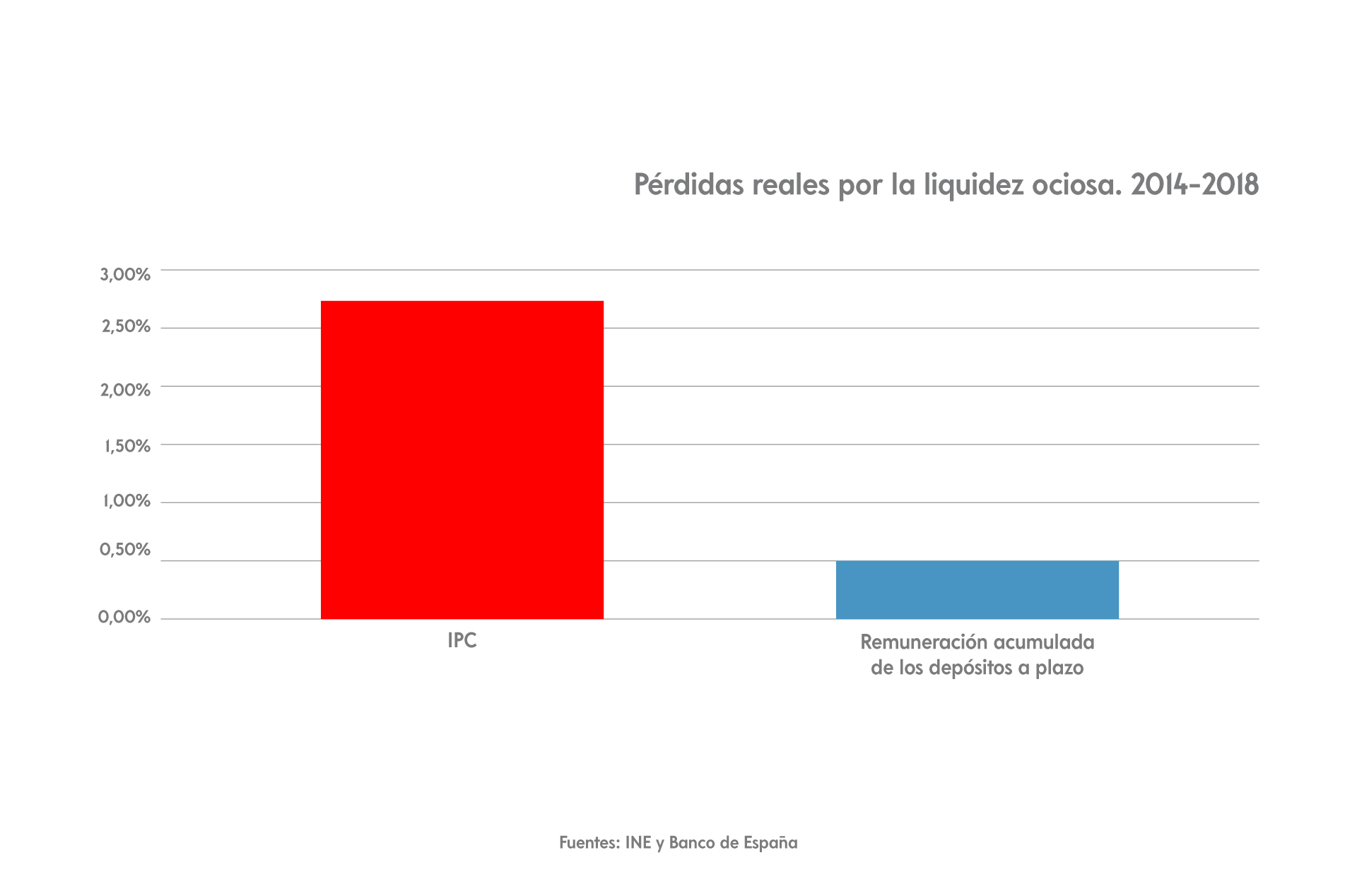 En los últimos cinco años, los precios han crecido un 2,85%. Eso significa que, si teníamos ahorrados 10.000 euros en el periodo inicial, hoy necesitaríamos 10.284,91 euros para adquirir la misma cantidad de bienes y servicios. Supongamos que esa liquidez quedó apartada en un depósito a plazo anualizado remunerado con un 0,10%. Hubiéramos obtenido una rentabilidad acumulada del 0,50%, y conseguido finalmente 10.050,10 euros. La pérdida real vinculada a nuestra excesiva liquidez hubiera sido de 2,35 puntos porcentuales.