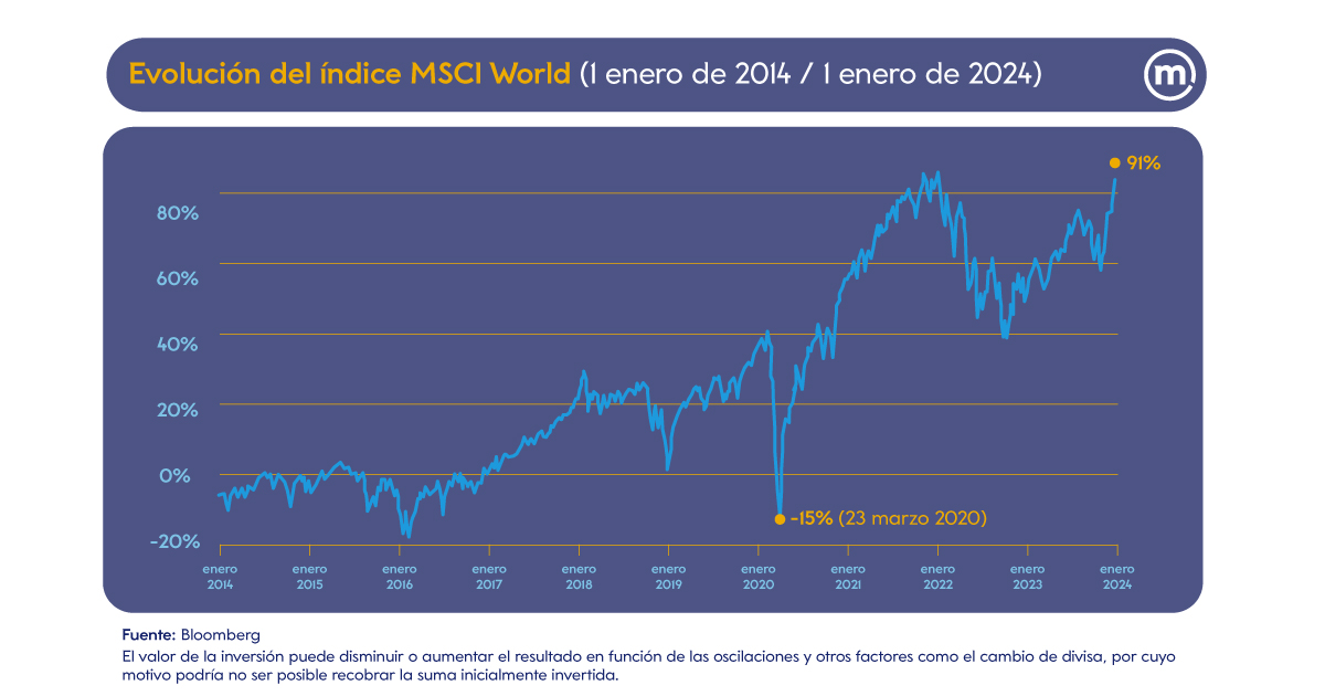 Si en lugar de un lustro, tomamos como referencia un horizonte temporal de diez años, entre enero de 2014 y enero de 2024, el índice MSCI World se revalorizó un 91%.