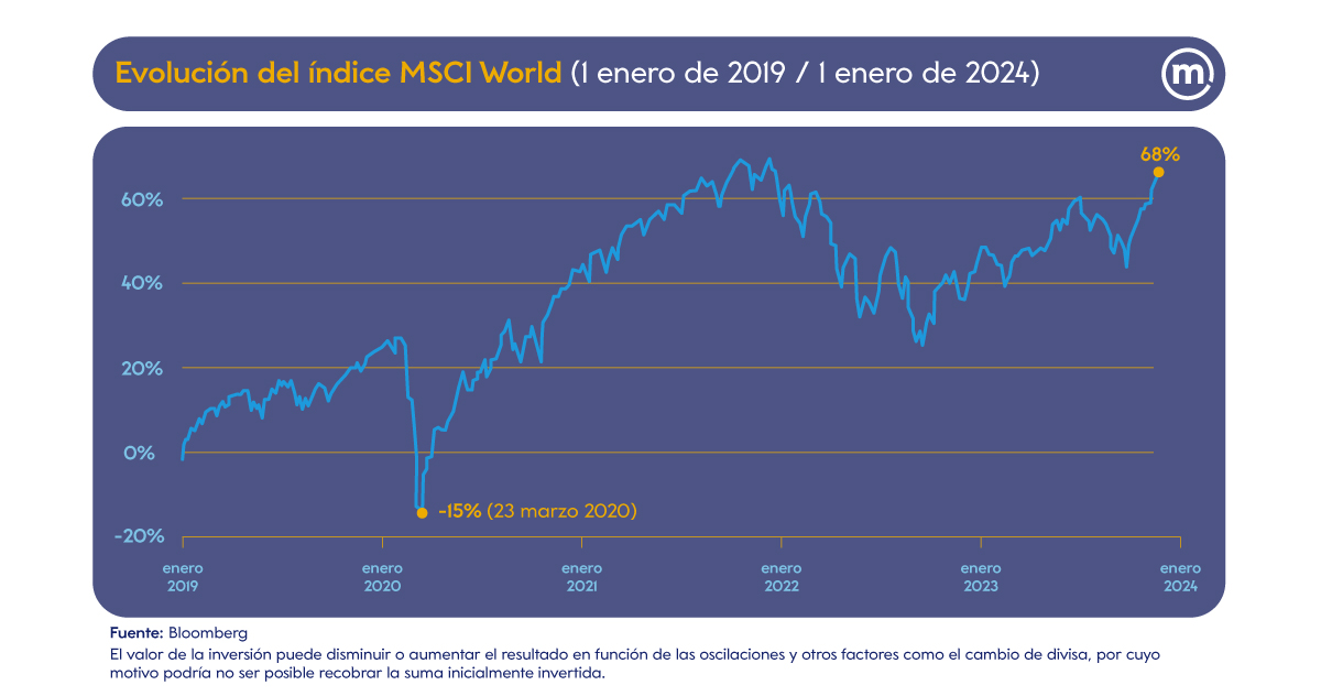 En cambio, si aplicamos una visión de más largo plazo, y observamos un periodo completo de cinco años —entre el 1 de enero de 2019 y la misma fecha de 2024—, el índice MSCI World se revalorizó un 68%.