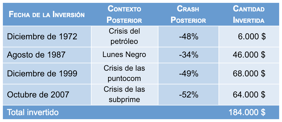 Aquí están las fechas de inversión, con las caídas de mercado que sucedieron y la cantidad invertida por fechas: